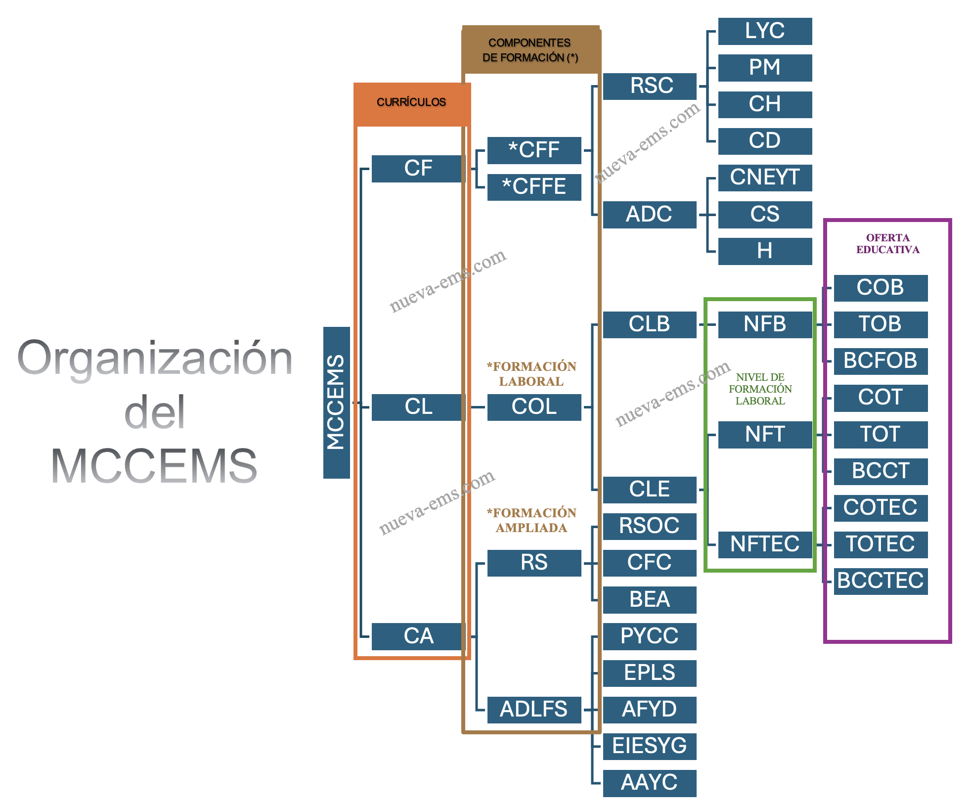 El MCCEMS está organizado por currículos como se muestra en la imagen superior y cuyas siglas se detallan a continuación: